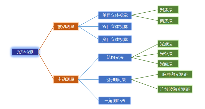 光學測量分為兩種測距法,一種是主動,一種是被動。主動測距方法是需要用特定的、人主動去控制光源以及聲源,對被測物體進行照射,我們依據(jù)物體的表面反射特性、光學和聲學特性來獲得被測物體的三維信息。主動測距方法主要分為三種:(1)結(jié)構(gòu)光法(2)三角測距法(3)飛行時間法;被動測距方法主要為雙目立體視覺測量。